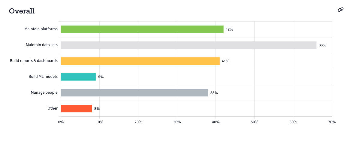 Next, most of their time teams dedicate to maintaining data sets. On the second place is maintaining a platform. For me, it is a positive trend because a valuable time is spent on business needs, rather than infrastructure. (Although, it might be a biased trend because most of the responders are working closely with analytics).